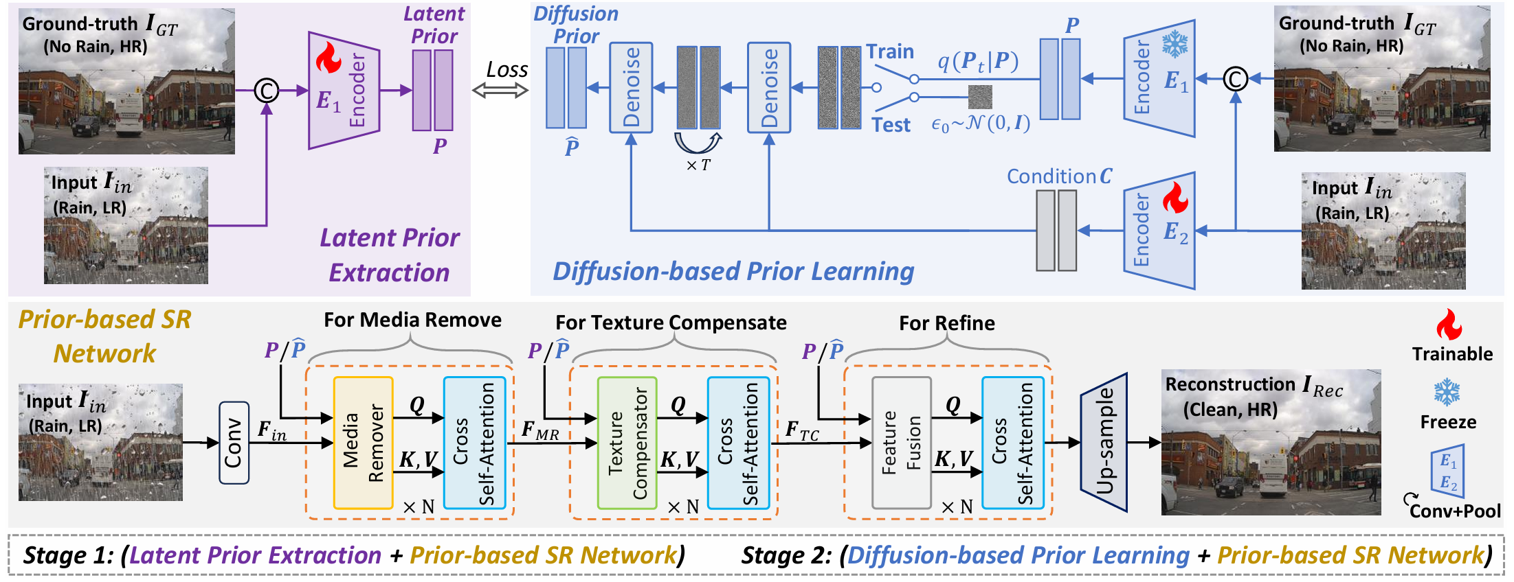 Overview: Our method utilizes our Media Remover (MR) and Texture Compensator (TC) to guide learned diffusion priors in latent spaces to complete high-frequency rain-induced media removal and high-frequency texture reconstruction.