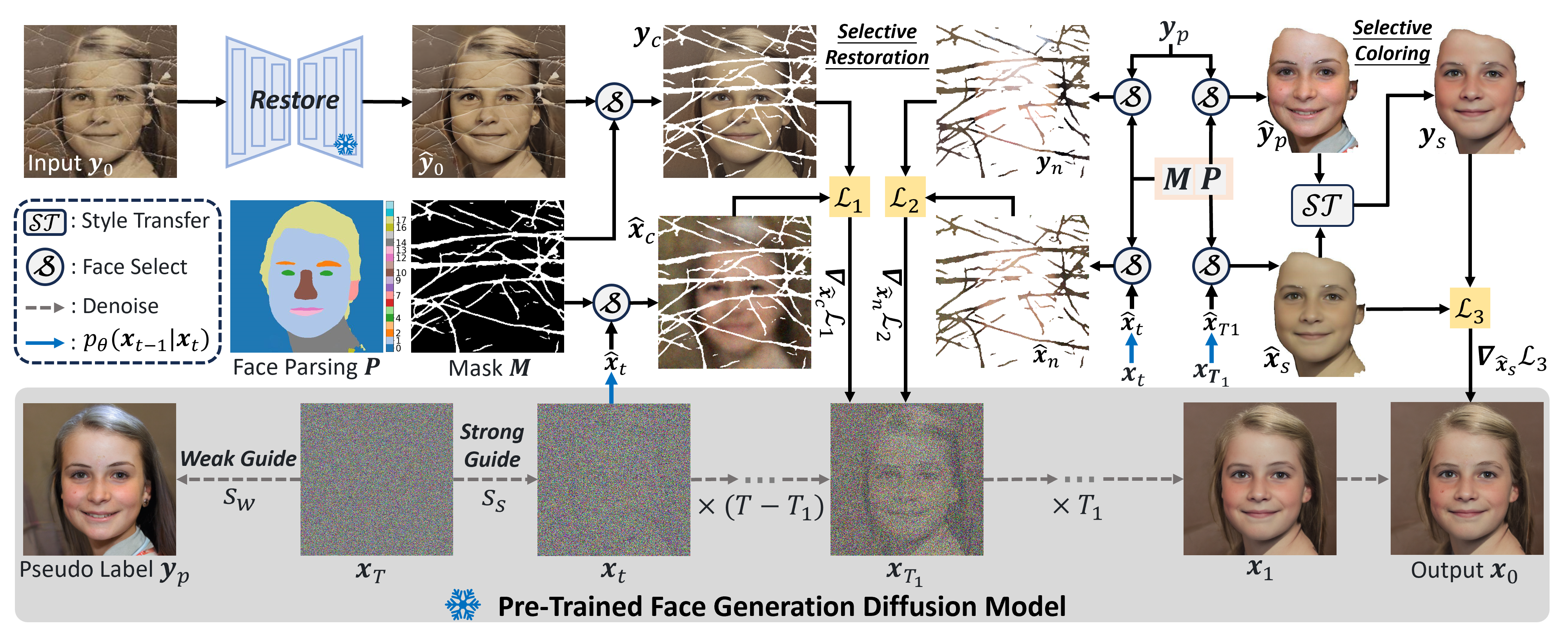 Overview of our SSDiff: (a) We first generate pseudo labels for faces using a pre-trained generative diffusion model under weak guidance. (b) Under strong guidance in pre-trained generative diffusion model, we employ pseudo-labeled faces and apply diffusion guidance techniques to first perform selective restoration, followed by selective colouring.